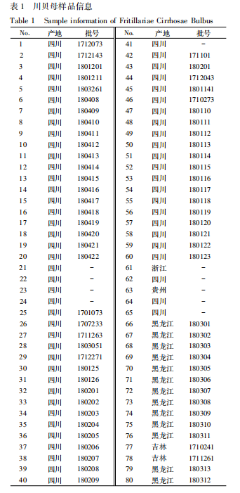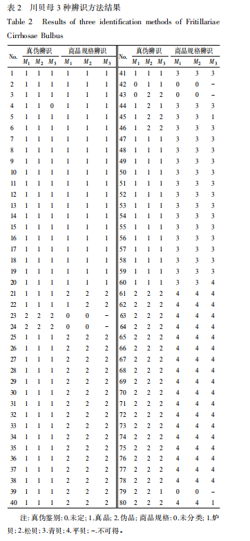 真?zhèn)舞b別 23,24,61~80 號(hào)樣本為偽品,42,43 號(hào)未判出,其余均為真品。商品規(guī)格鑒別 1~20 號(hào)為爐貝,21,22,25~40 號(hào)為松貝,41,44~60 號(hào)為青貝,61~78,80 號(hào)為平貝,79 號(hào)樣本專家評(píng)價(jià)結(jié)果分歧較大,且任一種結(jié)果都不滿足≥3 /4比例原則,因而被剔除,見表 1。