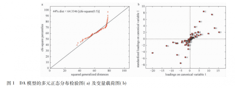 DA 辨識(shí)模型及交互驗(yàn)證 80 個(gè)樣本的測試結(jié)果多元正態(tài)分布檢驗(yàn)圖見圖 1,橫坐標(biāo)為平方廣義距離,縱坐標(biāo)為卡方上側(cè)分位數(shù)對(duì)應(yīng)的檢驗(yàn)值。樣本分布圖形略呈線性; 約 44%的距離小于卡方分布分位數(shù)表 0. 5 對(duì)應(yīng)的檢驗(yàn)值,說明檢驗(yàn)值在卡方分布分位數(shù)表 0. 5 對(duì)應(yīng)的檢驗(yàn)值的下側(cè)分布略微集中。