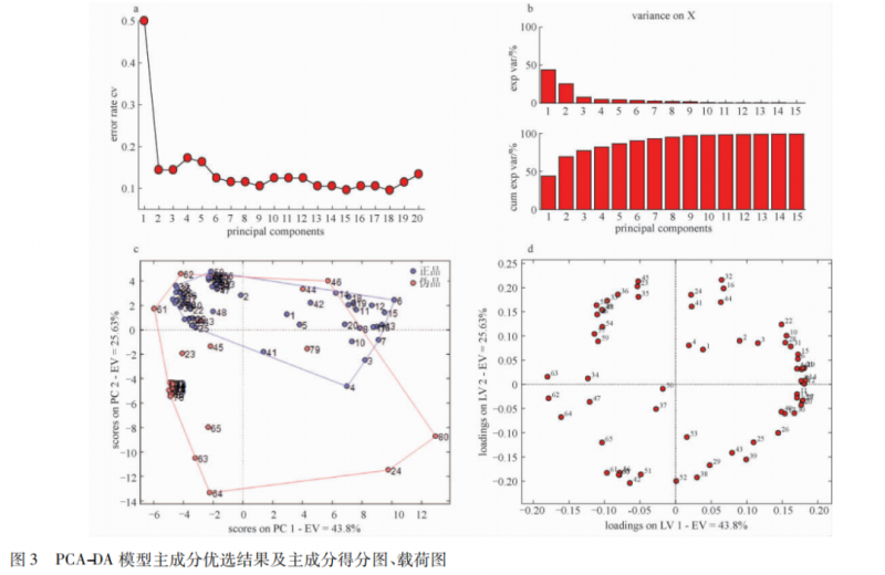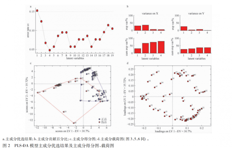 PLS-DA 辨識(shí)結(jié)果顯示,54 個(gè)正品中有 1 個(gè)被錯(cuò)判為偽品,26 個(gè)偽品有 2 個(gè)被錯(cuò)判為正品,模型整體正判率為 96. 2%。