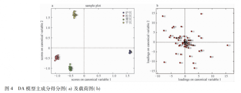 結(jié)果顯示,20 個(gè)爐貝樣本分類均正確; 18 個(gè)松貝樣本分類均正確; 18 個(gè)青貝樣本中有 1 個(gè)被錯(cuò)判成爐貝; 19 個(gè)平貝樣本中有 1 個(gè)錯(cuò)判成爐貝; 不存在未分類的樣本,整體正判率為 97. 3%。