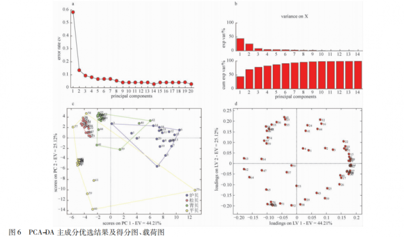 變量選擇14 個(gè),識(shí) 別 模 式 選 擇 線 性; 模 型 最 優(yōu) 正 判 率 為97. 3%。前 3 個(gè)主成分之和達(dá) 75%以上,可解釋原變量大部分信息,見圖 6。