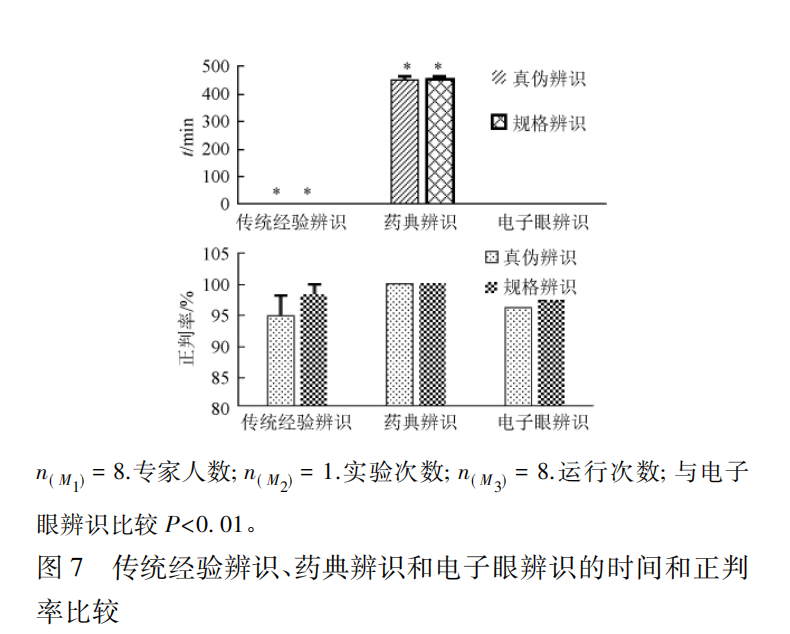 通過比較,電子眼辨識(shí)與傳統(tǒng)經(jīng)驗(yàn)辨識(shí)正判率無顯著性差異; 電子眼辨識(shí)不如傳統(tǒng)經(jīng)驗(yàn)辨識(shí)快( P<0. 01) ,但較藥典檢測快( P<0. 01) ,見圖 7。