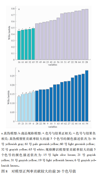 在只考慮變量信息本身、不考慮分類結(jié)果模型的情況下,65 個(gè)變量所攜帶變異信息( Wilkslamda) 的柱狀圖見圖 8,Wilkslamda 越小則表示變量攜帶變異信息越多。真?zhèn)伪孀R(shí)中 65 個(gè)變量在潛變量上的載荷圖,見圖 2,50 號(hào)變量在原點(diǎn)附近,說明該特征屬性的波動(dòng)對(duì)于樣本之間的區(qū)別貢獻(xiàn)不大,其余64 個(gè)變量整體較為分散,說明這 64 個(gè)變量均攜帶有顯著的變異信息。商品規(guī)格辨識(shí)中 65 個(gè)變量在潛變量上的載荷圖見圖 6。