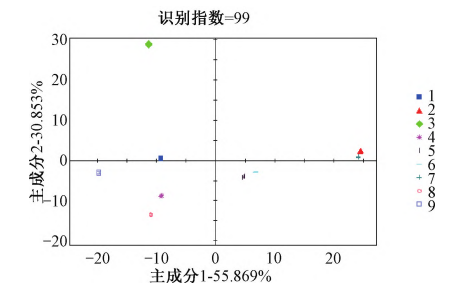 由圖4可知,PC1與PC2的貢獻率之和達到了95.057%,其識別指數(shù)達到99,說明基于氣味上的差異能有效區(qū)分不同產(chǎn)地地黃樣品。河南溫縣與甘肅所產(chǎn)“北京3號”各單獨分布在一個區(qū)域,與其他產(chǎn)區(qū)氣味差別較大;山西與陜西所產(chǎn)“北京3號”氣味差別較小,利用AroChemBases數(shù)據(jù)庫對篩選出的差異較大的色譜峰進行定性可知,生地黃氣味差異可能由于乙醛、乙醇、2,3?丁烷、乙腈、己醛等揮發(fā)性氣體含量差異引起,說明使用電子鼻能迅速區(qū)分同一品種不同產(chǎn)地生地黃。