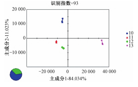 采用Alpha soft軟件對所得數(shù)據(jù)進行分析,利用主成分分析(PCA)法,通過對原始數(shù)據(jù)向量進行線性變換,對多個數(shù)據(jù)進行降維處理,轉(zhuǎn)化為少數(shù)綜合指標(biāo)。