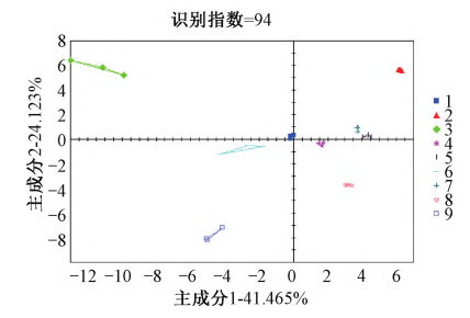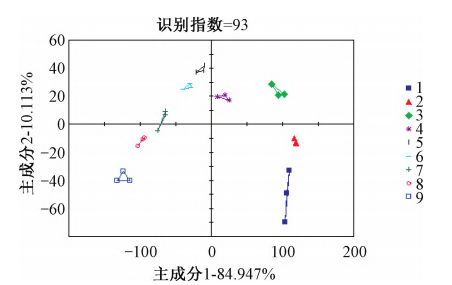 懷區(qū)9種不同主栽品種懷地黃RSD分別為0.42%、1.35%、0.56%、0.34%、0.42%、0.22%、0.22%,樣品3次重復(fù)間相對標(biāo)準(zhǔn)偏差都比較小,說明樣品在重復(fù)測試過程中電子舌儀器的穩(wěn)定性、重現(xiàn)性好。由圖5可知,PC1與PC2的貢獻率之和達到了95.060%,其識別指數(shù)為93,說明這9種生地黃樣品滋味能夠快速地通過電子舌很好區(qū)分開來。在主成分分析圖中,樣品間的相對距離越近,則樣品整體滋味越接近,其中“金九”與“85?5”樣品的相對距離最近,滋味差別最小;“噸王”與“沁懷”的相對距離最遠,滋味差別最大。