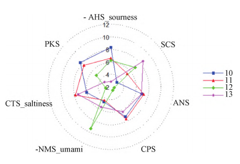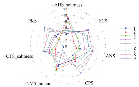 圖8 不同產(chǎn)地“北京3號”生地黃滋味雷達圖