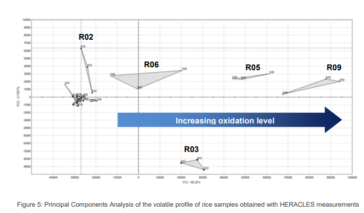 本研究表明,Heracles主成分分析可以在采集完樣品之后直接區(qū)分大米的氣味差異,同時此次實驗還成功地用于快速比較幾種大米樣品中2-乙酰基-1-吡咯啉的含量,以及氧化指標(biāo)(己醛)的含量。