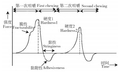質地剖面分析測試原理是模擬人體口腔咀嚼運動,通過對樣品2次擠壓進行測定。質地剖面分析曲線見圖1。咀嚼性為硬度、凝聚力和彈性3個參數值的乘積,常作為質地結構綜合指標。