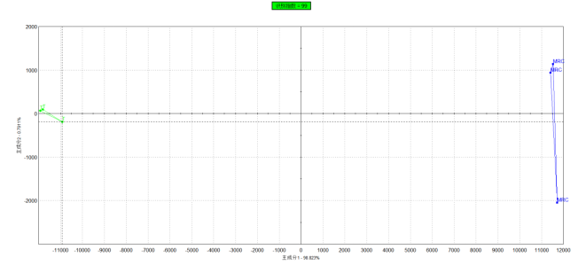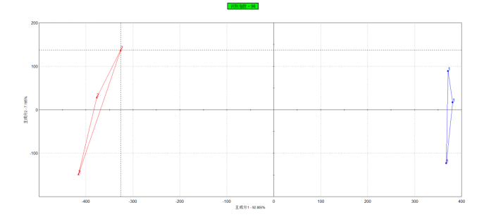 PCA是將采集到的氣味成分的種類和含量作為變量,通過向量變化以更直觀的形式體現樣品間的氣味組成差異,圖2為原始PCA圖(以所有色譜峰為變量)。第一主成分(PC1)與 第二主成分(PC2)的貢獻率之和達到了 99.6141%,能較為完整的代表樣品的全部信息;樣品間的差異主要反應在橫軸上距離的遠近(第一主成分貢獻率顯著 93.823%)。2個樣品在主成分分析圖上的區(qū)分指數達到(Discrimination Index)99,說明超快速氣相色譜電子鼻(Heracles)能夠基于氣味的差異,有效區(qū)分2個牛奶樣品。