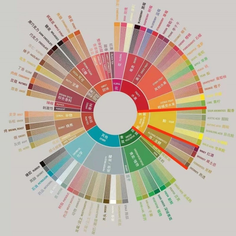 風(fēng)味輪采用圓盤車輪的外觀設(shè)計,是一種使用感官描述詞匯描述產(chǎn)品味道、香氣及其所在類別的工具。同時,風(fēng)味輪賦予味道、香氣及其所在類別不同的色彩,以幫助我們更精準(zhǔn)、快速的描述和評價食物。