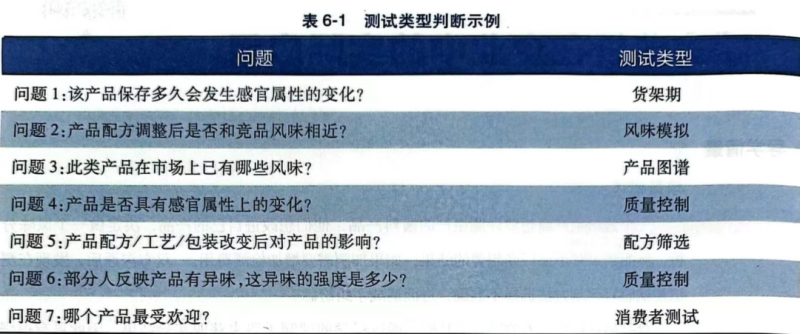 當企業在新產品開發環節中運用到感官評價時,研發人員以及營銷人員會針對感官分析師提出很多問題。在企業運用中,我們根據目的可以將感官評價分為以下幾類:貨架期、配方篩選、產品圖譜、質量控制、風味模擬、消費者測試,見表6-1。