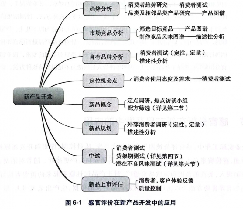 完整的新品開發流程具有很多環節,其中包含產品趨勢分析,自有品牌分析,新品概念的生成,產品線規劃,中試以及新品上市放行等。因此,在新品開發中感官評價的方法是綜合性的,即多個感官測試貫穿于整個新品開發流程中。常見方法分布見圖6-1。