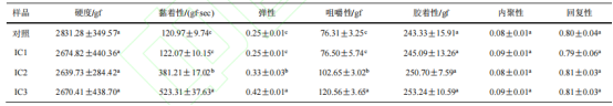 如表3所示,IC1組與對照組在硬度、黏著性、彈性、咀嚼性、膠著性、內(nèi)聚性和回復性特性方面均無顯著差異(P>0.05),說明添加香精對冰淇淋的質構無顯著影響。而IC2組和IC3組的硬度略有降低,但差異不顯著,其黏著性、彈性和咀嚼性顯著高于對照組。黏著性、彈性和咀嚼性的提高說明添加芒果粉增強了冰淇淋在受力擠壓后的回彈能力,并增加了冰淇淋在口腔中的咀嚼次數(shù),延長了口腔中芒果和牛奶味道的感知時間,有利于提高口腔對于芒果和牛奶味道的感知,同時也會賦予冰淇淋以更光滑的口感。而在膠著性、內(nèi)聚性和回復性方面,IC2組和IC3組冰淇淋與對照組間無顯著差異(P>0.05)。