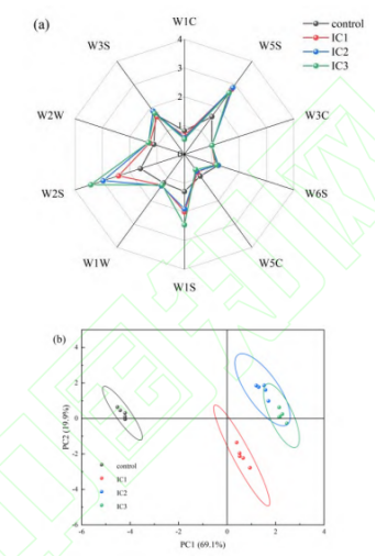 圖2 冰淇淋電子鼻雷達圖和主成分分析圖