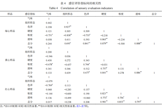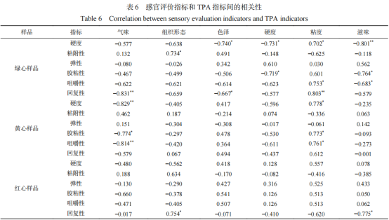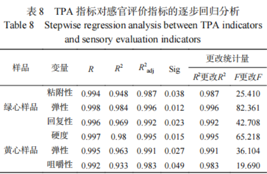 為進(jìn)一步探究質(zhì)構(gòu)評價(jià)指標(biāo)能否被用來代替感官評定指標(biāo),準(zhǔn)確反映大眾的感官真實(shí)值,以TPA指標(biāo)作為因變量,主要感官評價(jià)指標(biāo)為自變量進(jìn)行逐步回歸分析,顯著水平為0.05。其中綠心樣品的粘附性、彈性、回復(fù)性的逐步回歸分析中R均大于0.900,擬合度較高,說明對感官評價(jià)結(jié)果預(yù)測效果比較好,因此綠心樣品可以利用儀器測定的粘附性、彈性、回復(fù)性替代感官評價(jià)得分;另外黃心樣品的硬度、彈性、咀嚼性的回歸分析中R均大于0.900,擬合度較高,因此黃心樣品可以利用硬度、彈性、咀嚼性來替代感官評價(jià)得分;而紅心樣品質(zhì)構(gòu)指標(biāo)替代感官評分還有待進(jìn)一步研究。