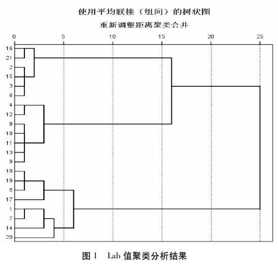 綜合Lab值和RGB值聚類分析,兩個顏色系統都可以對黃桃罐頭色澤進行分類,但是RGB值更接近于人眼視覺,能更好的對黃桃罐頭進行分類。