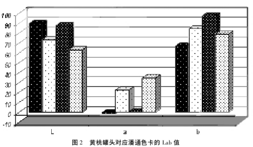 將黃桃罐頭打開將桃瓣放在白色磁盤上,將產品放置在色差儀的光圈內,每個桃瓣測三個點,每罐取3個桃瓣,結果取其平均值。其中L表示亮度,+a表示偏紅,-a表示偏綠,+b表示偏黃,-b表示偏藍。