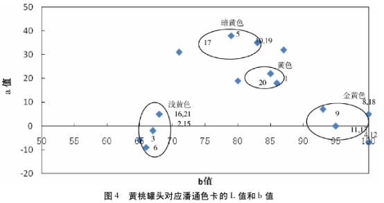 黃桃罐頭對應潘通色卡a值和b值分布見圖4,由圖可以看出淺黃色的a值、b值都是最低,暗黃色的a值最大,金黃色的b值最大。從而可以得出金黃色、黃色、淺黃色、暗黃色四類顏色的a值和b值范圍見表4。