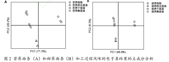 主成分分析(PCA)是一種方便的數據轉換和降維方法,它可以轉換和縮小從電子鼻傳感器獲得的多指標信息的維數,并獲得最重要和最主要的貢獻因子。對比苦蕎與甜蕎樣品風味時,可以看出苦蕎樣品和甜蕎樣品主成分的貢獻率之和分別達到98.5%和98.1%,大于95%,并且第一主成分(PC1)的貢獻率遠大于第二主成分(PC2)的貢獻率,說明這兩個指標可以基本上代表了樣品的主要風味特征,并且PC1為主要貢獻物。PC1主要由T30/1、P10/1、P10/2、P40/1、T70/2和PA/2這六個傳感器檢測的風味成分貢獻,PC2主要由LY2/G、LY2/AA、LY2/GH、LY2/gCTL傳感器檢測的風味成分貢獻。