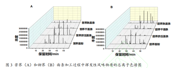 圖3給出了在苦蕎和甜蕎樣品中的揮發性風味化合物的瀑布圖。瀑布圖顯示了所有化合物的原始信息,從中可以確定樣品中每個揮發性風味化合物的信號峰值強度和峰值位置。