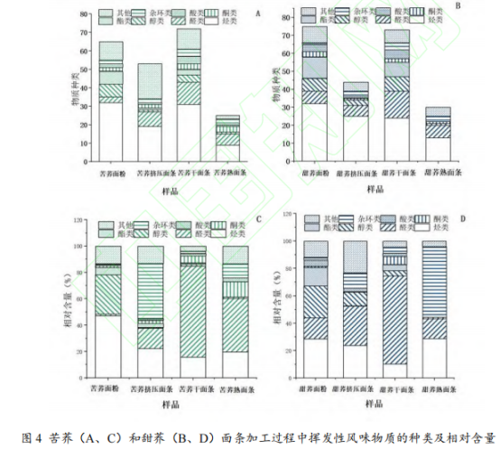 經GC-MS分析后,并與NIST08.L和RTLPEST3.L數據庫對比,在苦蕎粉、苦蕎擠壓面條、苦蕎干面條、苦蕎熟面條中分別鑒定出66種、53種、72種、25種揮發性風味物質。在甜蕎粉、甜蕎擠壓面條、甜蕎干面條、甜蕎熟面條中分別鑒定出75種、44種、73種、30種揮發性風味物質。